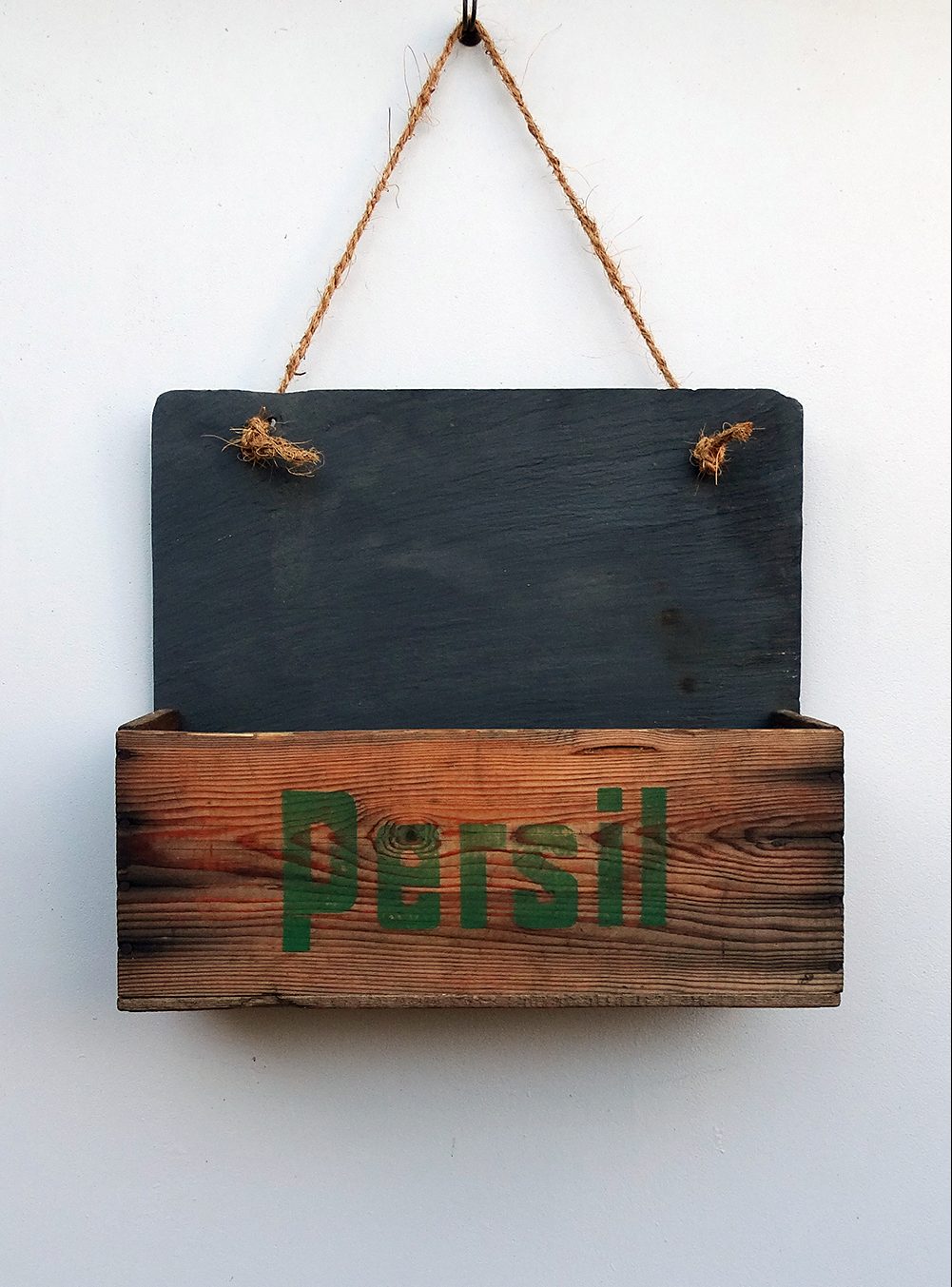 Ein besonderes Regal aus altem Schiefer mit einer Hälfte original Persil Holzkiste aus vergangenen Zeiten als Ablage. Ob als Wandregal oder zum Hinstellen – ein wirklich dekoratives Kleinmöbel. Der Schiefer kann sehr gut mit Kreide beschrieben werden. Ein Stück Kreide gibt es bei Bestellung des Schieferregals dazu. Das Regal ist mit Pflanzenöl behandelt, welches auch gut zum Reinigen des Schiefers geeignet ist.