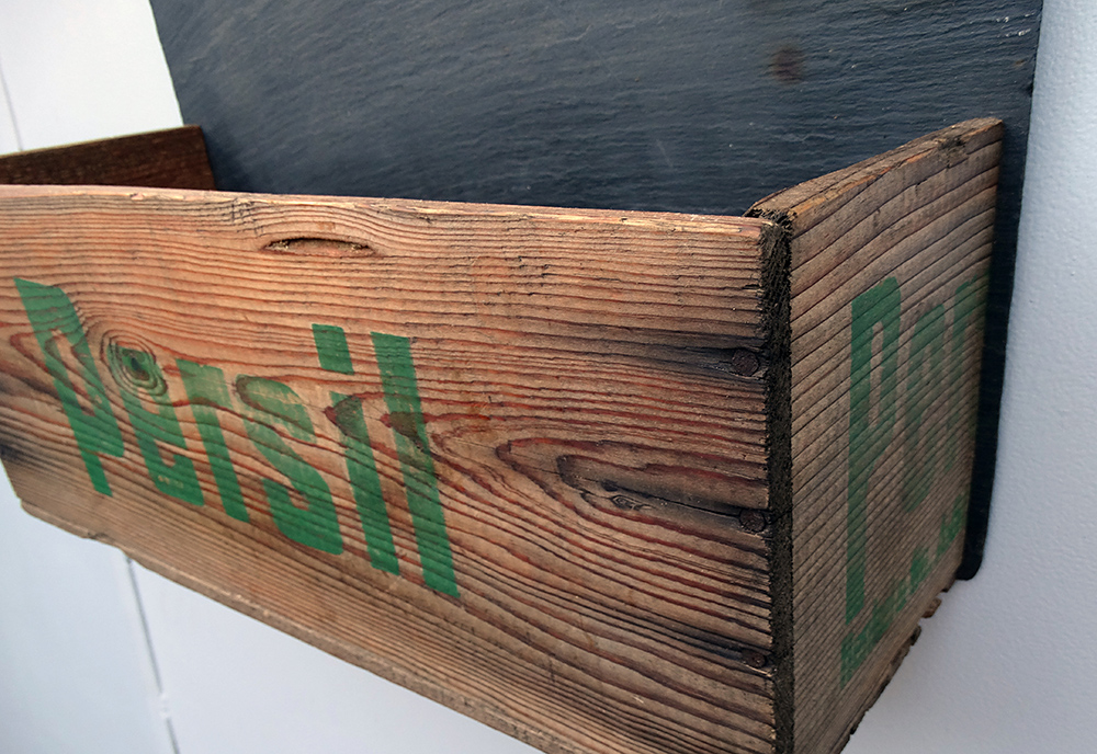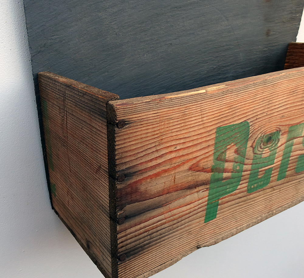 Regal aus altem Schiefer und original Persil Holzkiste aus vergangenen Zeiten