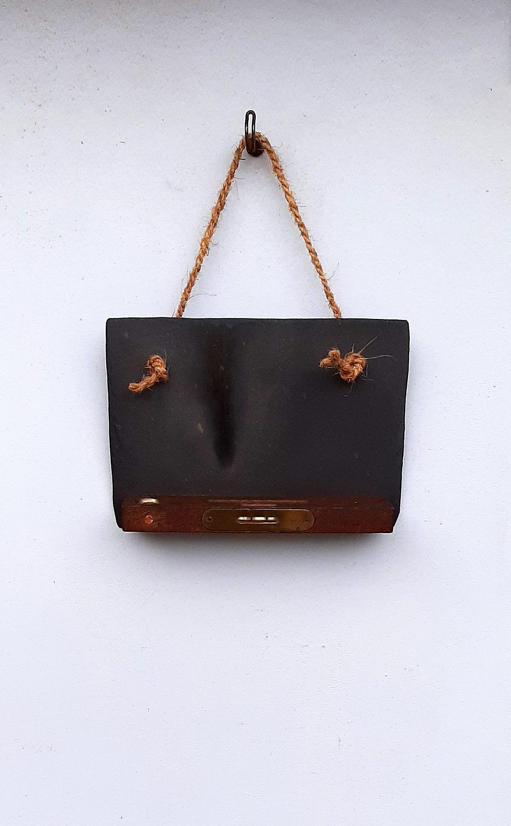 Löcher, Kratzer und Gebrauchsspuren an Schiefer und Holz sind altersbedingt und geben dem Einzelstück seinen besonderen Charme.