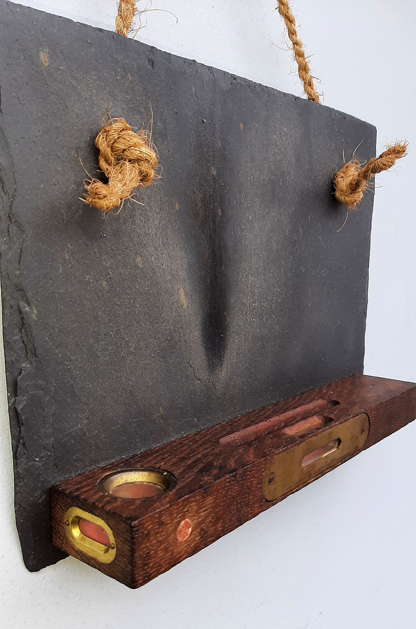 Ein besonderes Board aus altem Schiefer mit kleiner Holz-Wasserwaage aus vergangenen Zeiten als Ablage. Als Wandregal ein wirklich dekoratives Kleinmöbel. Der Schiefer kann sehr gut mit Kreide beschrieben werden. Das Regal ist mit Pflanzenöl behandelt, welches auch gut zum Reinigen des Schiefers geeignet ist.