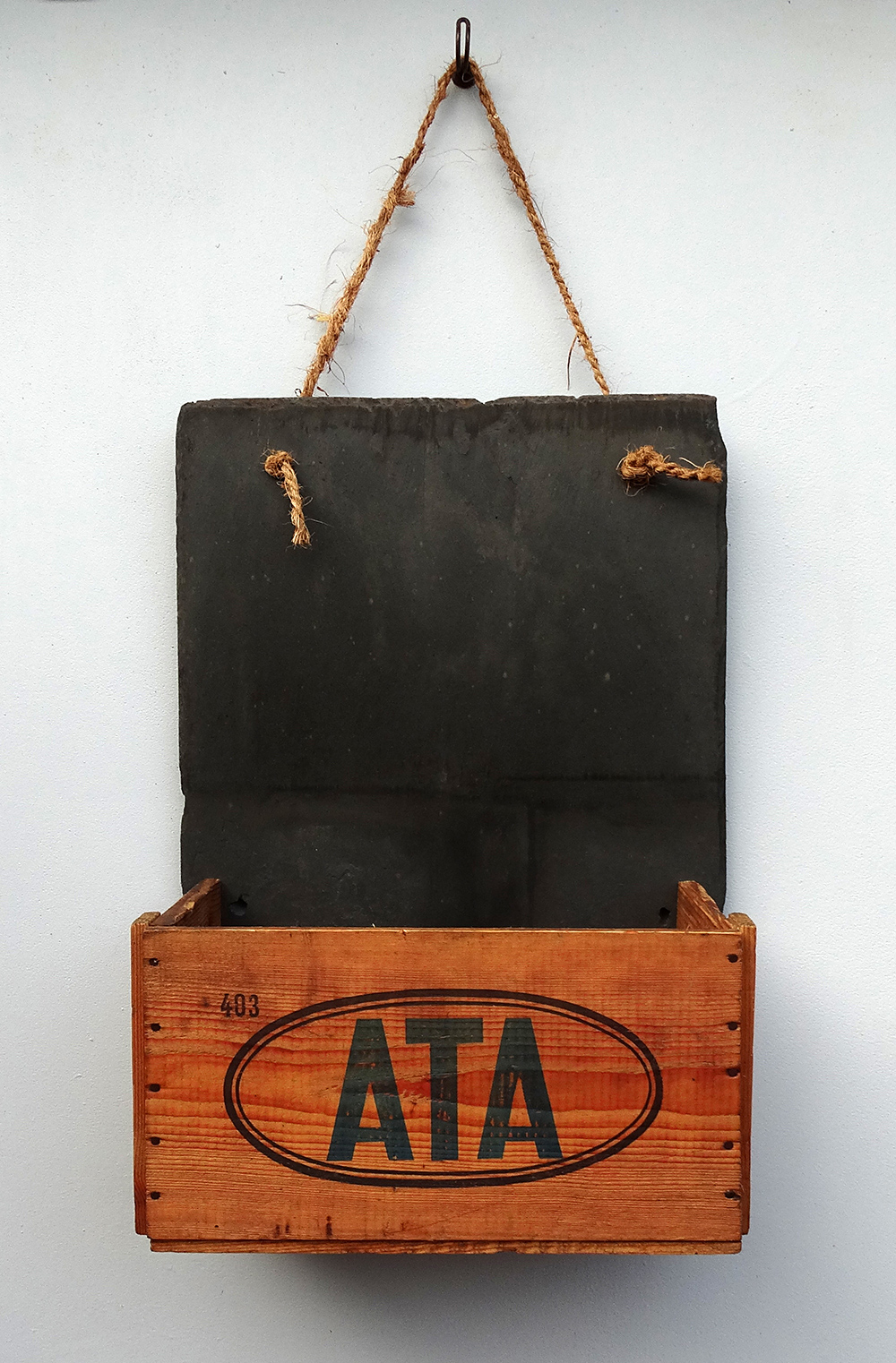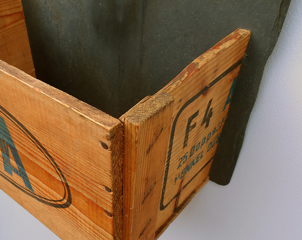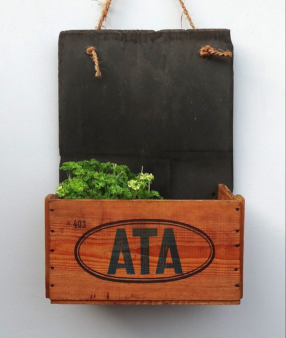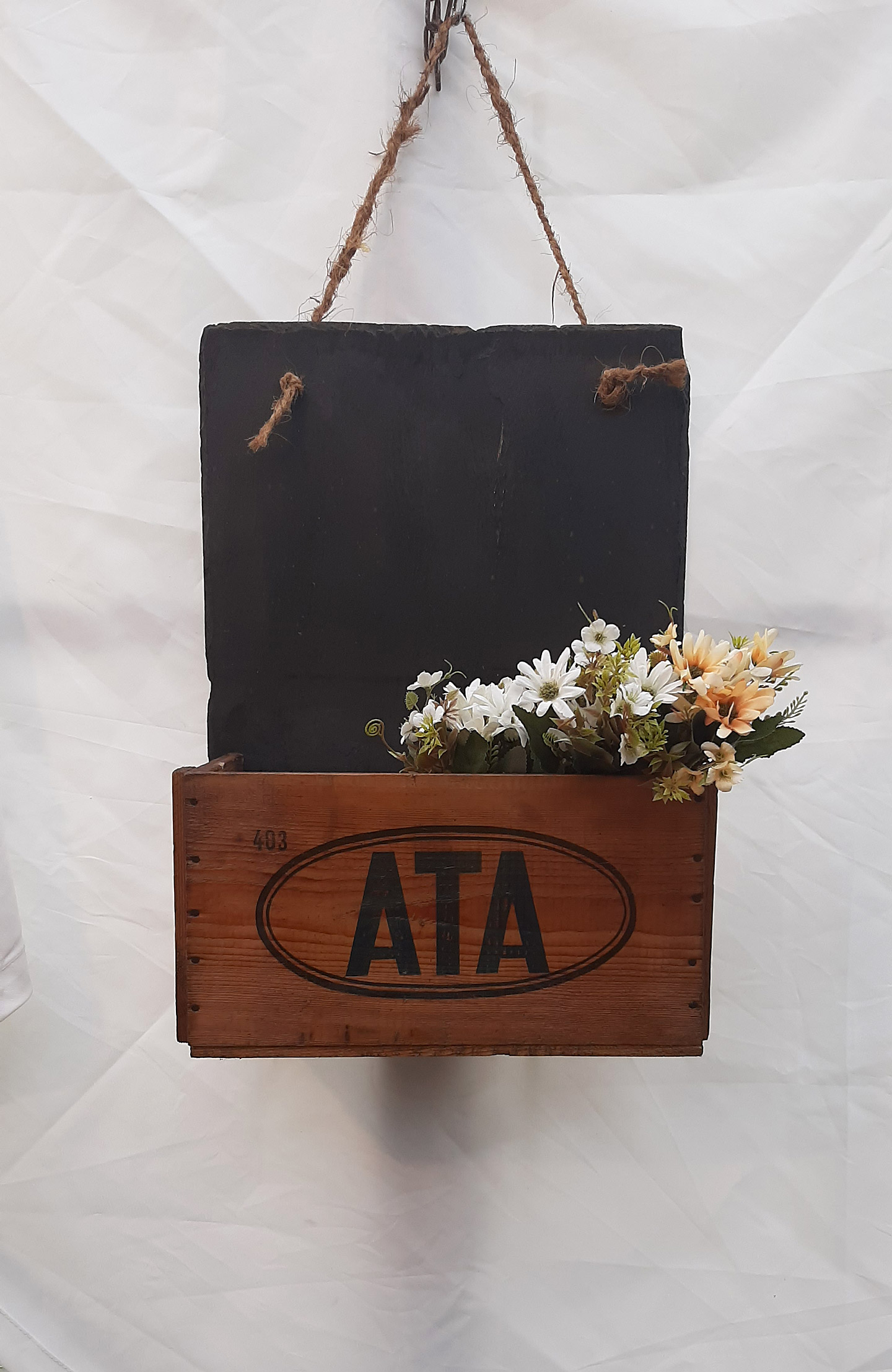 Ein besonderes Regal aus altem Schiefer mit einer Hälfte original ATA Holzkiste aus vergangenen Zeiten als Ablage. Ob als Wandregal oder zum Hinstellen – ein wirklich dekoratives Kleinmöbel. Der Schiefer kann sehr gut mit Kreide beschrieben werden. Ein Stück Kreide gibt es bei Bestellung des Schieferregals dazu. Das Regal ist mit Pflanzenöl behandelt, welches auch gut zum Reinigen des Schiefers geeignet ist.