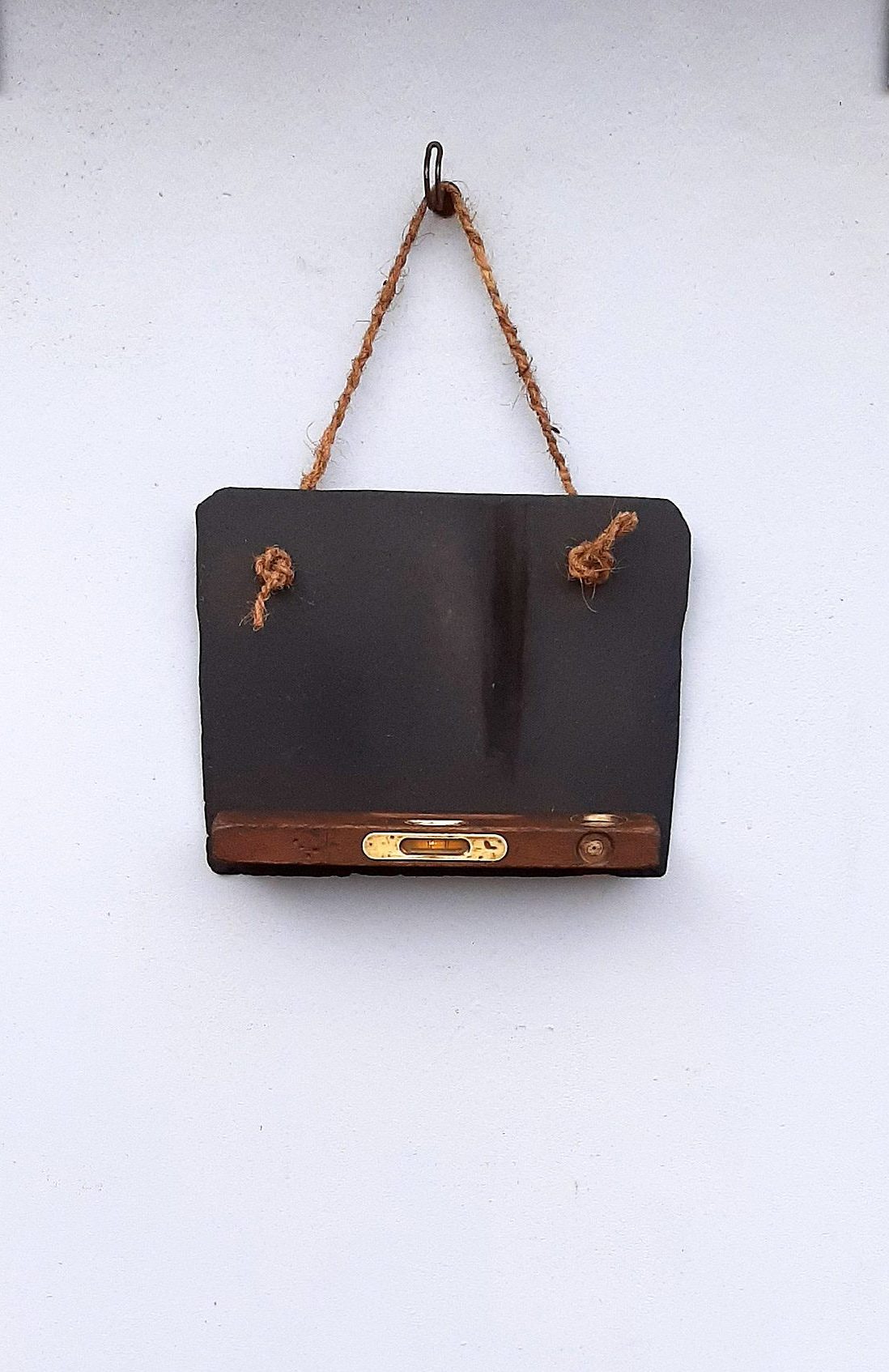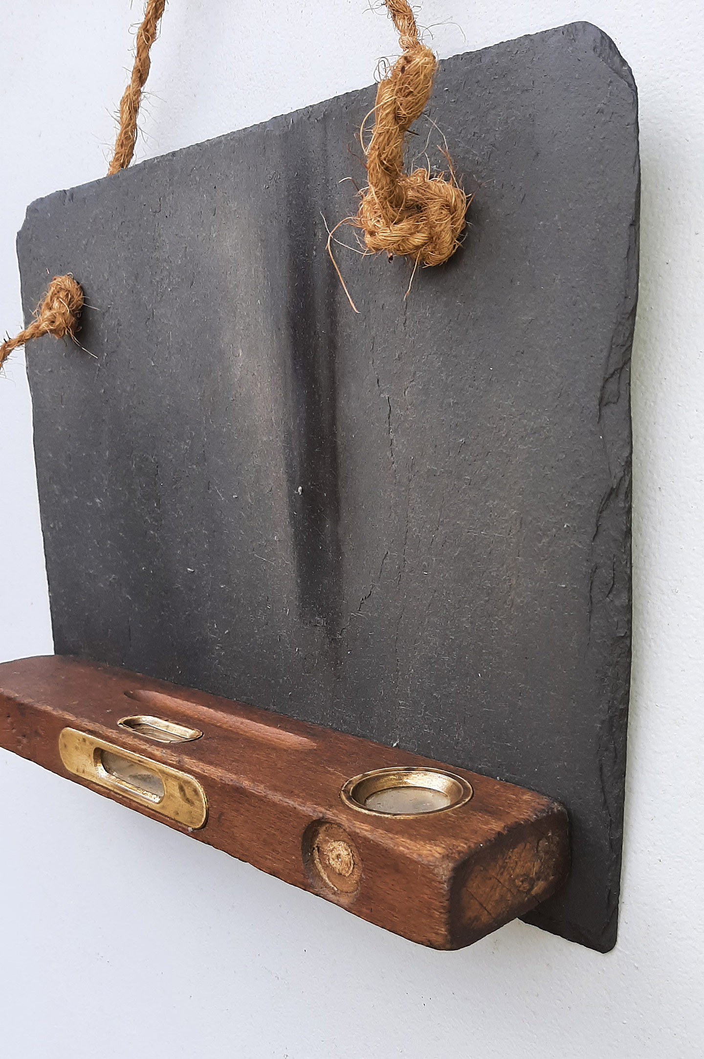 Ein besonderes Regal aus altem Schiefer mit einer kleinen Holz-Wasserwaage aus vergangenen Zeiten als Ablage. Als Wandregal ein wirklich dekoratives Kleinmöbel. Der Schiefer kann sehr gut mit Kreide beschrieben werden. Das Regal ist mit Pflanzenöl behandelt, welches auch gut zum Reinigen des Schiefers geeignet ist.