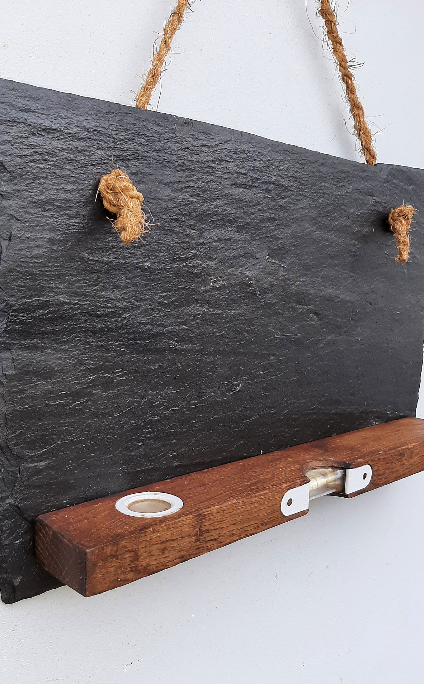 Ein besonderes Board aus altem Schiefer mit Holzwasserwaage aus vergangenen Zeiten als Ablage. Als Wandregal ein wirklich dekoratives Kleinmöbel. Der Schiefer kann sehr gut mit Kreide beschrieben werden. Das Regal ist mit Pflanzenöl behandelt, welches auch gut zum Reinigen des Schiefers geeignet ist.