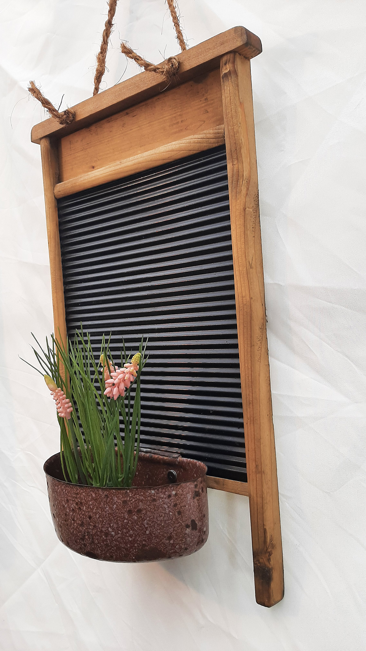 Ein besonderes Regal aus einem altem Waschbrett kombiniert mit einer nostalgischen Emaille-Schale aus vergangenen Zeiten als Ablage. Ob als Wandregal oder zum Hinstellen – ein wirklich dekoratives Kleinmöbel.